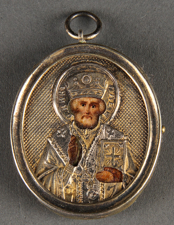 A RUSSIAN ICON OF ST. NICHOLAS WITH SILVER RIZA, CIRCA 1900. Hallmarked Moscow, Cyrillic markers mark S.G., and 84 silver standard, with suspension loop, 1.75 inches x 1.5 inches (4.5 x 3.8 cm).