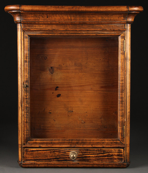A RUSSIAN ICON SHADOW BOX FRAME (KIOT), CIRCA 1860. With glazed hinged door above lower pull out drawer, interior opening 16.8 inches x 14.75 inches (42.5 x 37.5 cm), overall size 23.5 inches x 20.25 inches (59.7 x 51.4 cm).