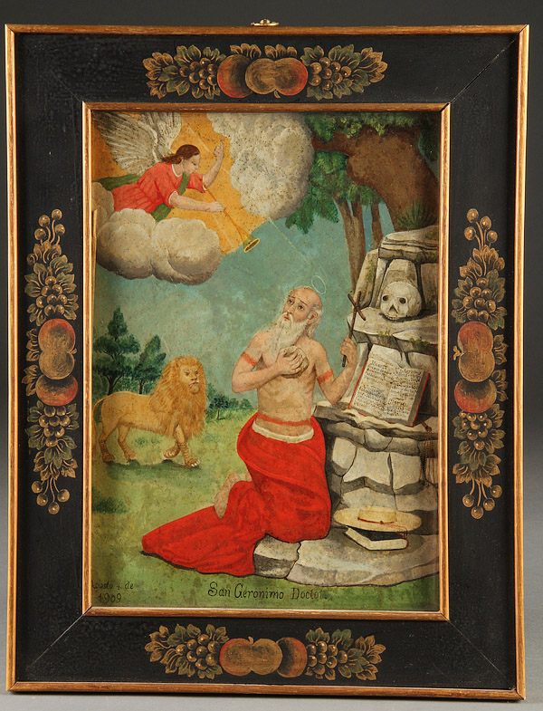 A MEXICAN RETABLO, ST. JEROME, 1909. A finely painted image of the penitent St. Jerome kneeling before a rocky altar with open book of gospels, a skull and other attributes, in the background a lion, in upper left a trumpeting angel of the Lord, inscribed "San Geronimo Doctor", and dated "Agosto 4 de 1909", contained in a later finely crafted and hand decorated Spanish Colonial style frame, 14 inches x 10 inches (35 x 25.5 cm). Provenance: Sotheby’s.