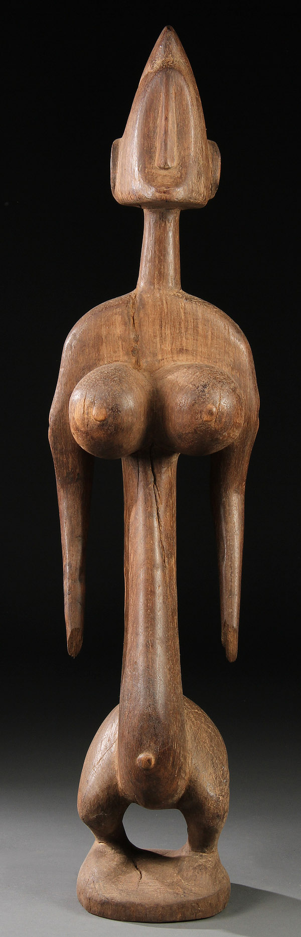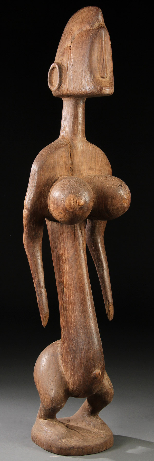 A CARVED WOOD AFRICAN FIGURE. Of a standing female. Height 41.5 inches (105 cm).