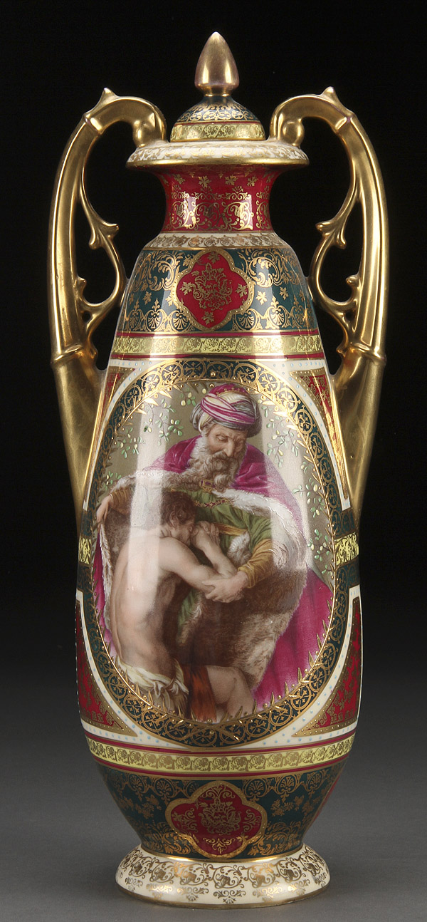 A LARGE AND IMPRESSIVE ROYAL VIENNA STYLE PORCELAIN PORTRAIT URN, 20TH CENTURY. With transfer decorated scene and scrolled gilt handles, marked Austria with blue shield mark. Height 15.25 inches (38.7 cm).