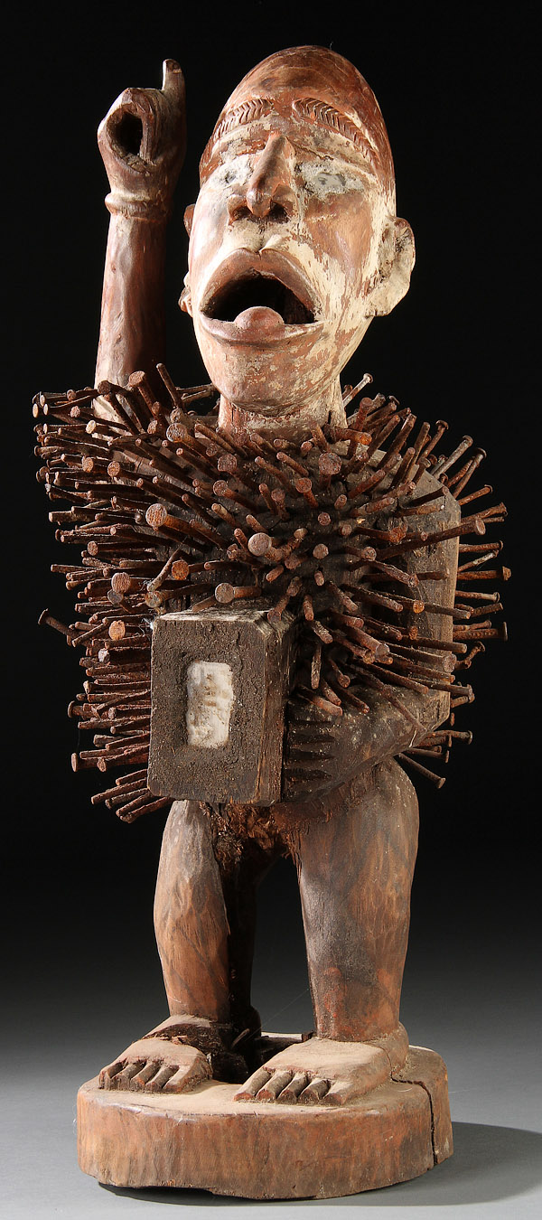 A CARVED AFRICAN FIGURAL WOODEN RELIQUARY. Of a standing male figure with inset glass eyes and remnants of white polychrome, impaled throughout midsection with iron stakes. Height 24.5 inches (62 cm).