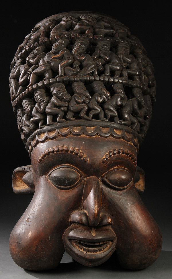 A CARVED WOOD AFRICAN KING'S MASK. In the Bamu-style. Height 30 inches (76.2 cm).