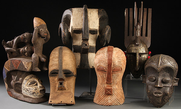 A GROUP OF SIX CARVED WOOD AFRICAN MASKS. Comprising Songe-style, Benalulua-style, Mambara-style, Yoruba-style kifwebe animal mask and others. Some with polychroming, some with metal embellishments. Greatest height 24.3 inches (61.7 cm).