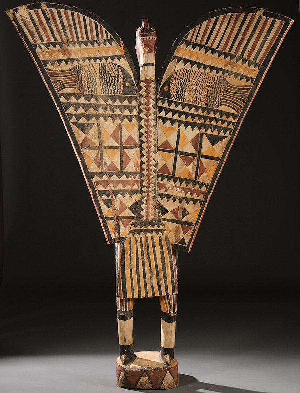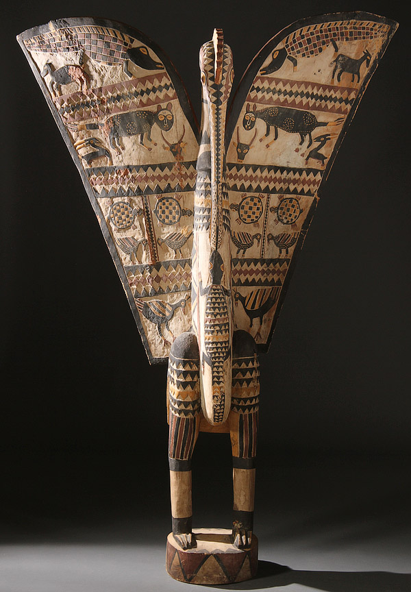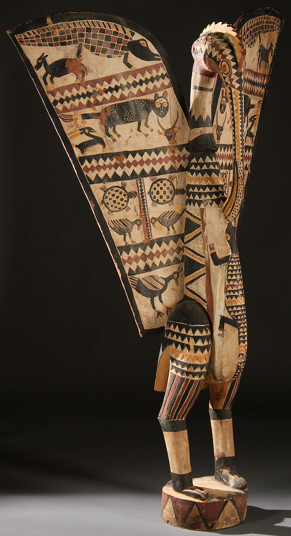 A CARVED WOOD AFRICAN FIGURE, LARGE AND IMPRESSIVE. Of a bird figure, with polychroming, geometric designs and animal figures. Height 88 inches (223.5 cm).