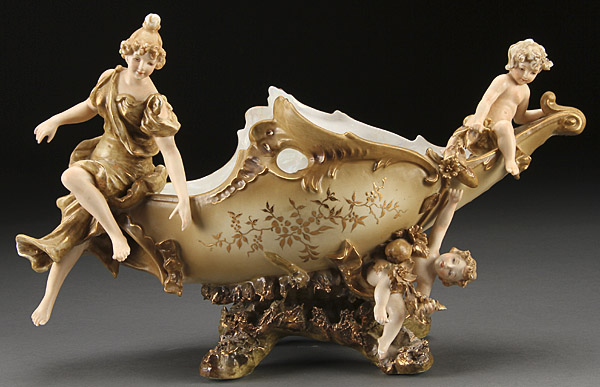 A JAPANESE FIGURAL PORCELAIN CENTERPIECE COUPE IN THE VICTORIAN STYLE, 20TH CENTURY. Depicting a young beauty with putti. Crossed arrow marks on base. Length 15.5 inches (39 cm).