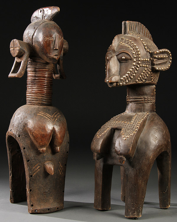 A PAIR OF CARVED WOOD AFRICAN FIGURES. In the Baga-style, one with metal adornments and one with wicker necklace. Greatest height 25.6 inches. (65.3 cm).