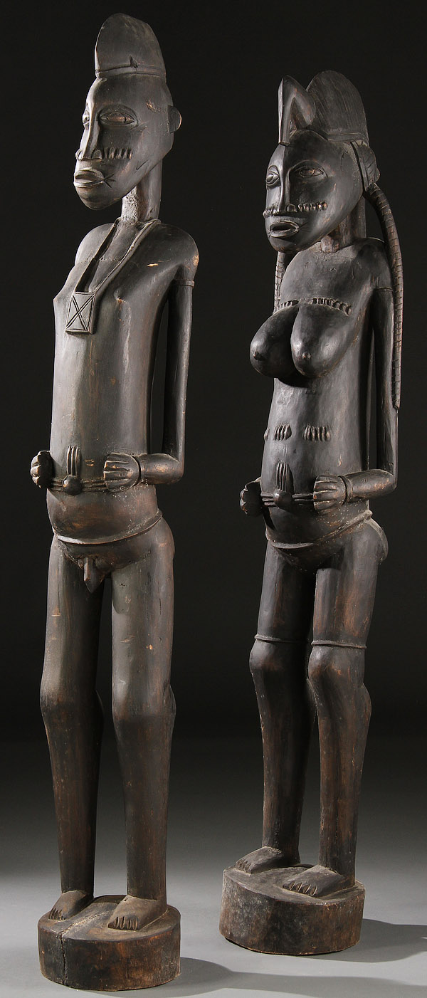 A PAIR OF LARGE CARVED WOOD AFRICAN FIGURES. Comprising a male and female, polychromed. Height 60.7 inches (169.1 cm).
