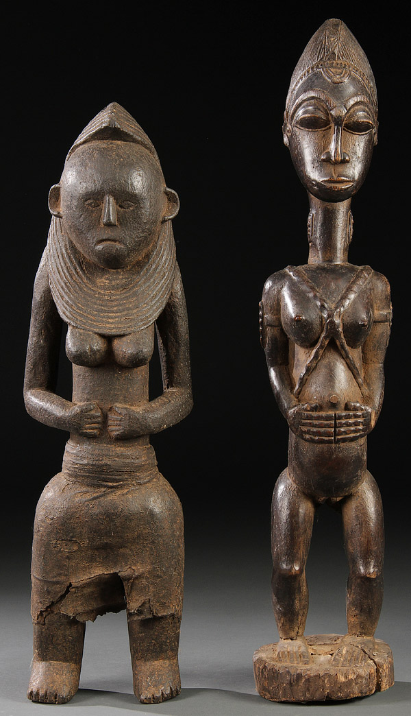 A PAIR OF CARVED WOOD AFRICAN FIGURES. Comprising a Marque-style and Baule-style figure. Greatest height 24.5 inches (62 cm).