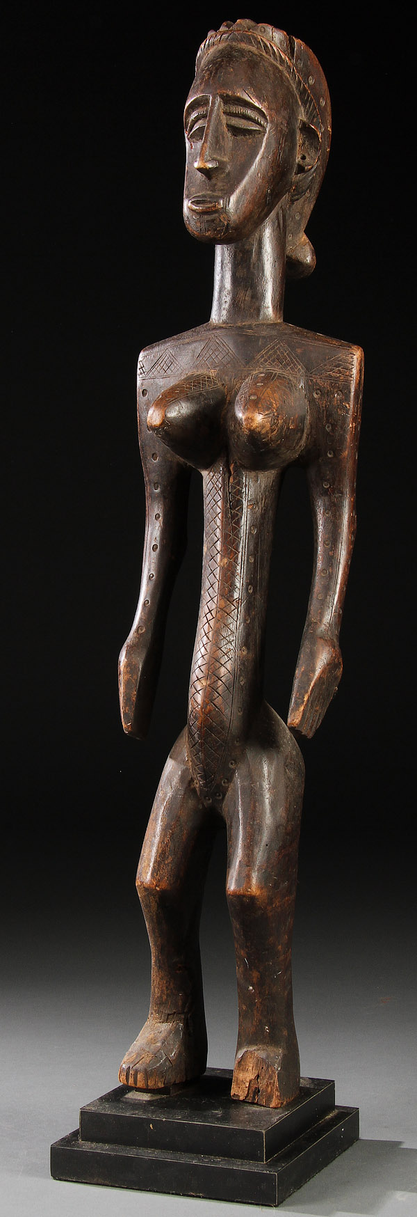 AN AFRICAN CARVED WOOD STANDING FIGURE. In the Bambara style, of a female. Height 27 inches (108.5 cm)