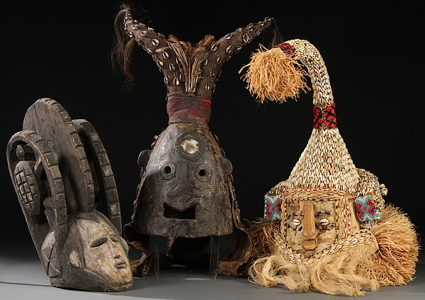 A GROUP OF THREE CARVED WOOD AFRICAN MASKS. Comprising Kuba and Baga-style masks. Some with shell, bead, grass and polychrome embellishments. Greatest height 22.5 inches (58 cm).