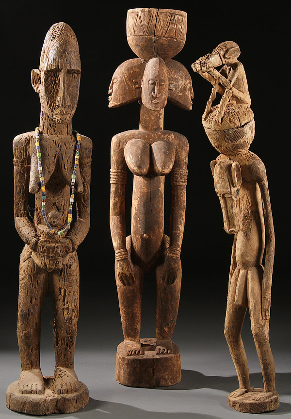 A GROUP OF THREE LARGE CARVED WOOD AFRICAN FIGURES. Comprising a male figure with beaded necklace, a Dogon-style divination female figure and a Dogon-style divination figure with monkey. Greatest height 50.1 inches (127.2 cm).