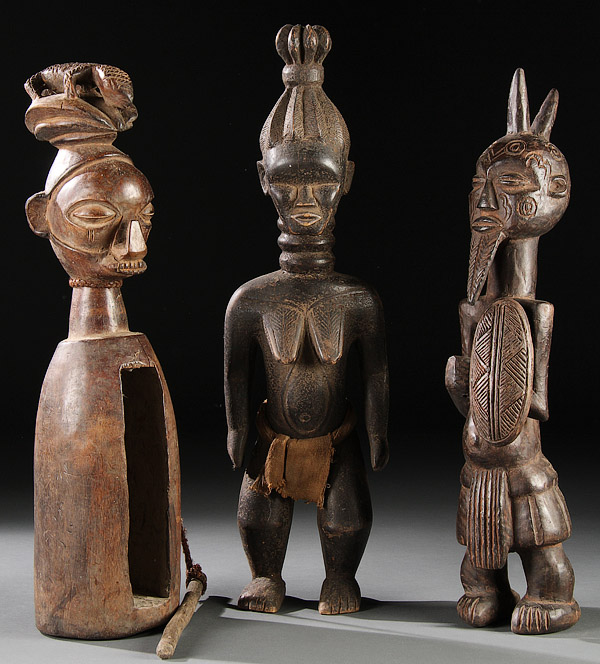 A GROUP OF THREE CARVED WOOD AFRICAN FIGURES. Comprising Yaka-style carved instrument, a Dan-style standing figure with loin cloth and a Lulua style figure holding a striated shield. Height 23.75 inches (60.5 cm).