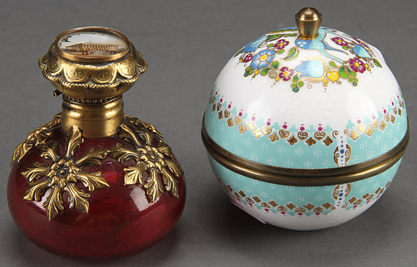 AN AUSTRIAN ENAMEL BRONZE DRESSER BOX AND GILT BRONZE MOUNTED PERFUME BOTTLE, 19TH/20TH CENTURY. The two piece dresser box marked "Email Studios" and the bronze mounted cranberry perfume with reverse decorated glass architectural scene on lid. Height 2.875 inches and 3 inches (7 cm and 7.5 cm).
