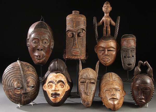 A GROUP OF NINE CARVED WOOD AFRICAN MASKS. Comprising Bobo-style, Yoruba-style, Yaure-style, Marka-style, Nebaka-style, Ibo-style, Punne-style, Bacongo-style and Kuba-style masks. Some with polychroming. Largest 21.3 inches (54.2 cm).