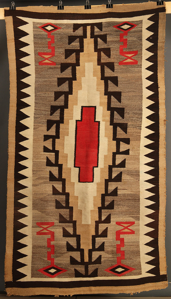 A NATIVE AMERICAN NAVAJO RUG, CIRCA 1930S. Hand woven wool in a geometric pattern of browns, gray, red and ivory. Erosion to edges. 50 inches x 80 inches (127 x 203 cm).