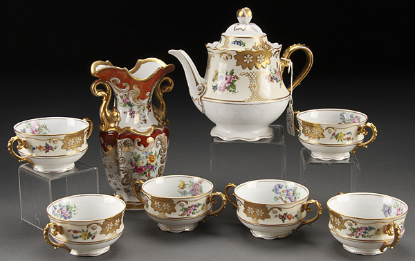 A PIRKENHAMMER CZECH GILT DECORATED PORCELAIN TEAPOT, EARLY 20TH CENTURY. With six matching two handled bouillons, together with a hand painted Old Paris vase (hairline). The largest height 8 inches (20 cm).