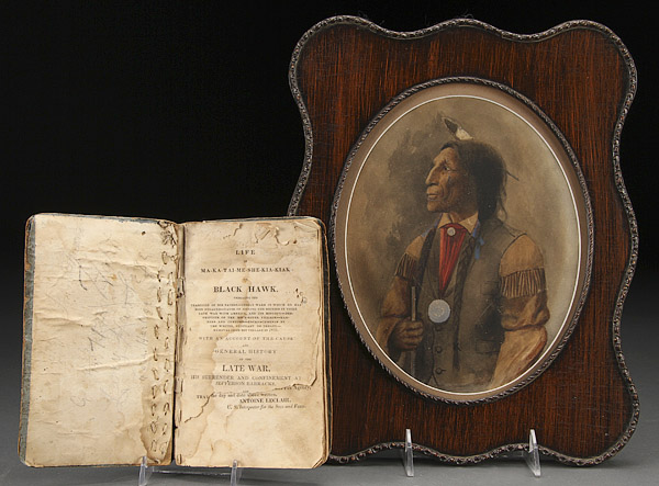 A BIOGRAPHY OF BLACK HAWK, 1ST EDITION, 1833. J.B. Patterson, Cincinnati, small 12 mo in blue paper covered boards, later leather spine and cloth ribbon stitched binding, 155 pages, losses to end papers and cover boards, uneven toning throughout. Together with a watercolor portrait of a Native American, circa 1900 by an anonymous artist, 7 inches x 9.5 inches (17.7 x 24 cm) contained in a period frame, 10.75 inches x 13.5 inches (27 x 34 cm) overall.