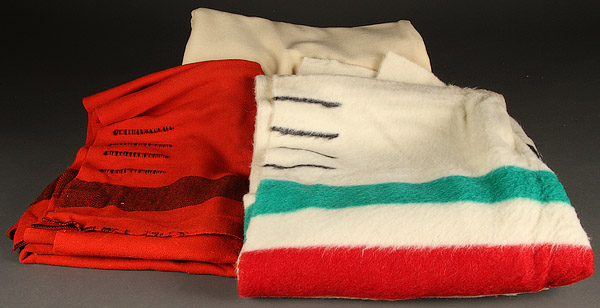 A HUDSON BAY FOUR POINT WOOL BLANKET. With Hudson Bay label, together with a red wool point blanket and a navy wool blanket.