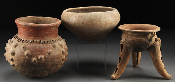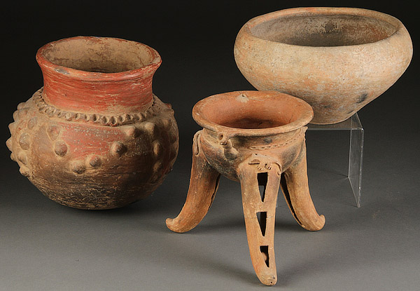 A THREE PIECE PRE-COLUMBIAN STYLE POTTERY GROUP. Probably Costa Rican comprising a tripod vessel with molded lizards and cut out legs. Together with a knobby decorated bowl, and a conical bowl with inverted rim. The largest 9 inches (23 cm) height.