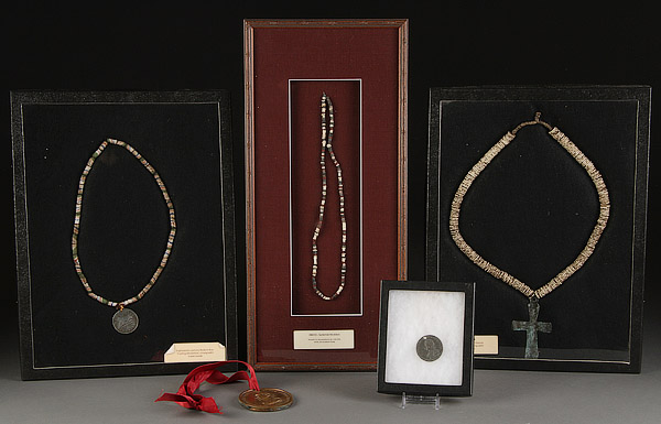 A COLLECTION OF NATIVE AMERICAN STYLE PEACE MEDALS AND TRADE BEADS, 20TH CENTURY. Comprising a cast bronze facsimile of 1849 Zachary Taylor, diameter 3 inches (7.6 cm); a William Henry Harrison for President medal (relic condition); a Hudson Bay style trade medallion with colored beads, length 11 inches (28 cm); a French 18th century style copper trade cross with shell beads, length 14 inches (35.5 cm); and an ancient style Sumerian necklace, length 12 inches (30.5 cm).