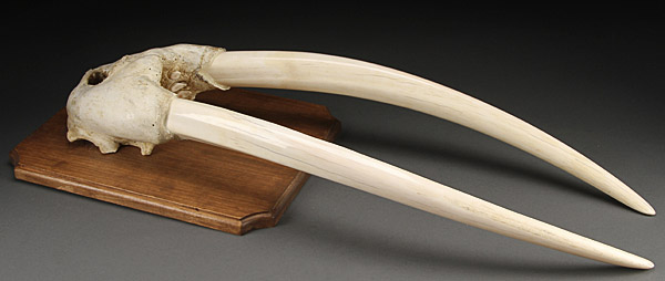 AN ALASKAN MOUNTED WALRUS TUSK TROPHY, POINT HOPE, 1970. With 23 inch ivory tusks set in partial skull and mounted on a wood plaque. The verso inscribed "Point Hope 1970, Fred Oolig." Total length 31 inches (79 cm).