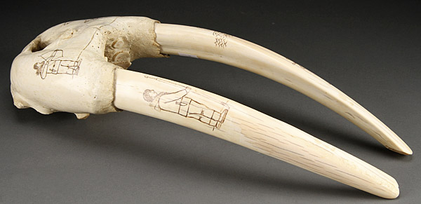 A PAIR OF ALASKAN DECORATED IVORY WALRUS TUSKS, EARLY TO MID 20TH CENTURY. With partial skull and penwork decoration of hunters and walrus scenes. Mounted for hanging. Length 20.5 inches (52 cm).