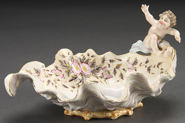 A GERMAN PORCELAIN FIGURAL COUPE, CIRCA 1900. In the form of a scallop with hand painted florals surmounted by a figural cupid handle (sans wings). Length 8.5 inches (21.5 cm).