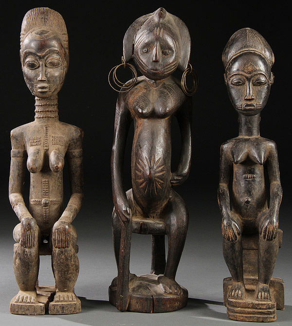 A GROUP OF THREE CARVED WOOD AFRICAN FIGURES. Including three seated female figures, one with earrings. Tallest 19 inches (48 cm).