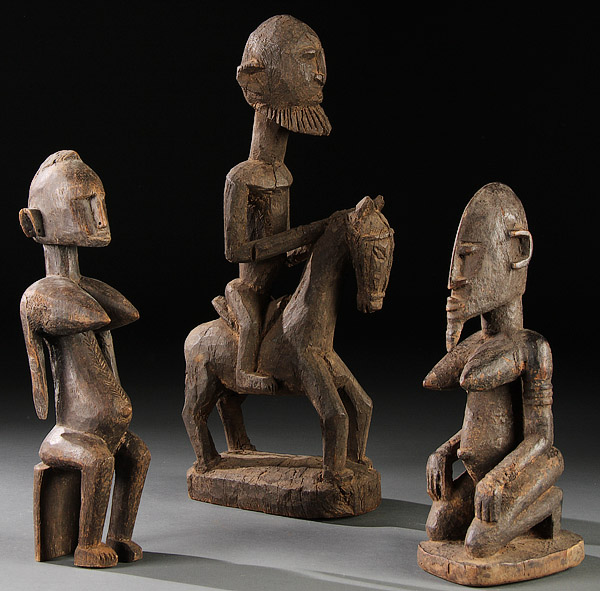 A GROUP OF THREE CARVED WOOD AFRICAN FIGURES. Comprising a Bambara-style fertility figure, a Dogon-style equestrian figure and a Dogon-style kneeling fertility figure. Tallest 19.5 inches (49.5 cm).