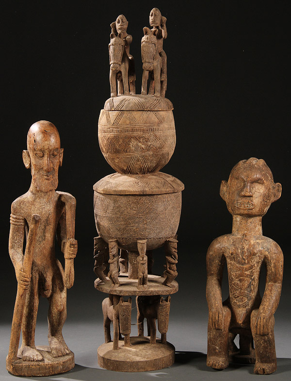 A GROUP OF THREE CARVED WOOD AFRICAN ITEMS. Comprising a Tabua-style figure, an ancestral figure and a ceremonial covered vessel. Greatest height 45 inches (114.5 cm).