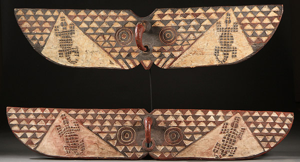 A PAIR OF LARGE CARVED WOOD AFRICAN MASKS. In the Bobo-style, with polychroming. Length 76 inches (186 cm).