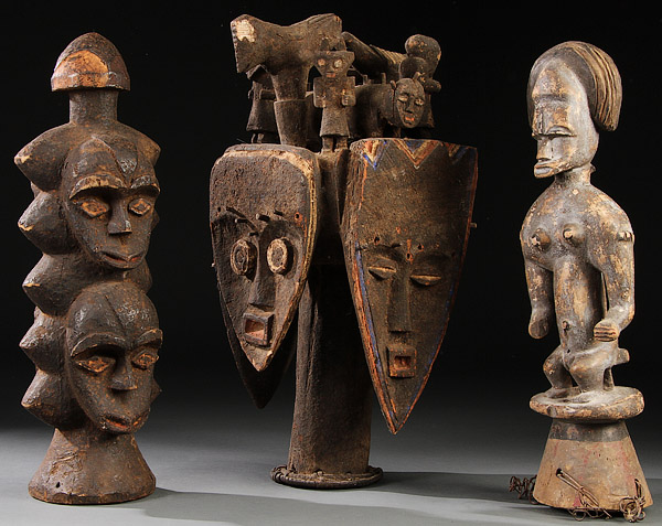 A GROUP OF THREE AFRICAN CARVED WOOD FIGURES. Comprising Bacongo-style, Mambika-style and Nigerian-style figures. Greatest height 24 inches (61 cm).