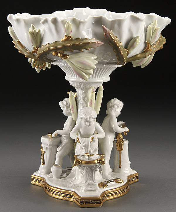 A JAPANESE FIGURAL COMPOTE IN THE EUROPEAN STYLE, LAST HALF 20TH CENTURY. The lily form bowl with applied florals above a figural stem with three allegorical putto fashioning cupid's arrows. Height 12.5 inches (31.5 cm).