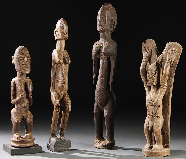 A GROUP OF FOUR CARVED WOOD AFRICAN FIGURES. Comprising Dogon and Mamo-style standing figures. Tallest 20 inches (51 cm).