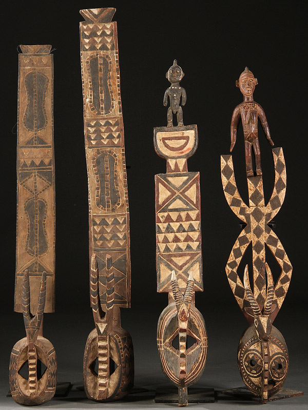 A GROUP OF FOUR LARGE CARVED WOOD AFRICAN MASKS. In the Mossi and Gurunsi-styles, all with polychroming. Greatest height 54 inches (137 cm).