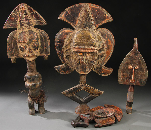 A GROUP OF FOUR AFRICAN CARVED WOOD ITEMS. All with metal overlay. Greatest height 30 inches (76 cm).