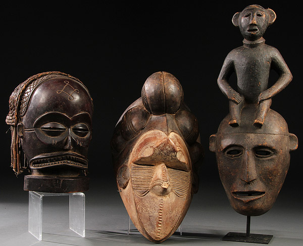 AN GROUP OF THREE CARVED WOOD AFRICAN MASKS. In the Makonde and Bulambo-styles. One with remnants of polychroming. Greatest height 23.25 inches (59 cm).