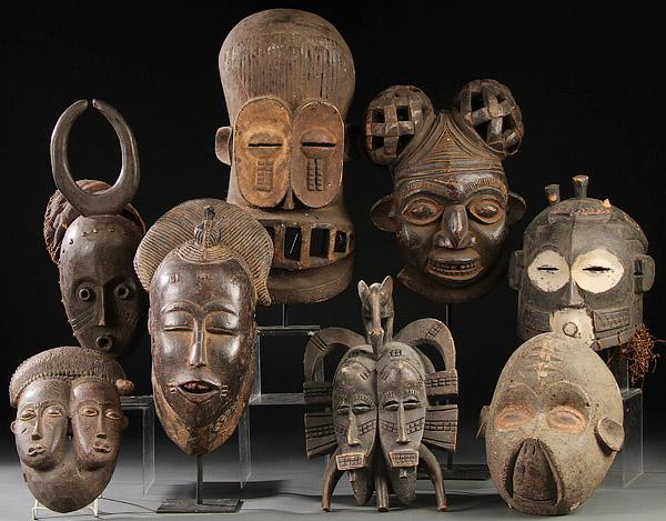 A GROUP OF EIGHT CARVED WOOD AFRICAN MASKS. Comprising Pende-style, Igbo-style, Baule-style and Senufo-style. Some with remnants of polychroming. Greatest height 18.5 inches (47 cm).