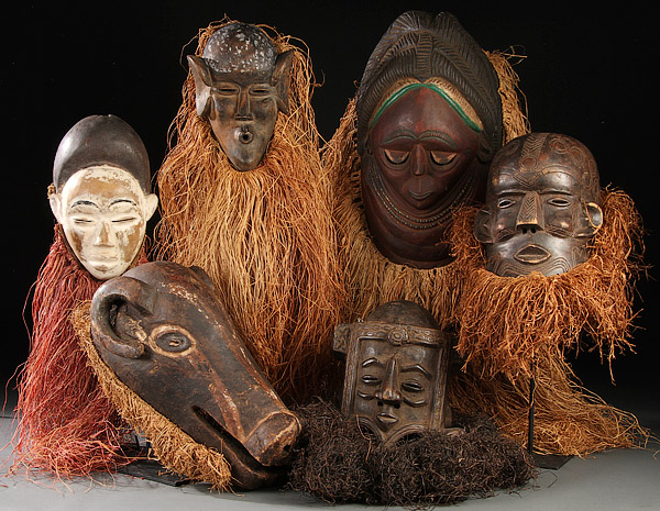 A GROUP OF SIX CARVED WOOD AFRICAN MASKS. All with grass embellishments in the Baga, Kuba, Baluba and Luba-styles. Greatest height (carving only) 21 inches (53.5 cm).