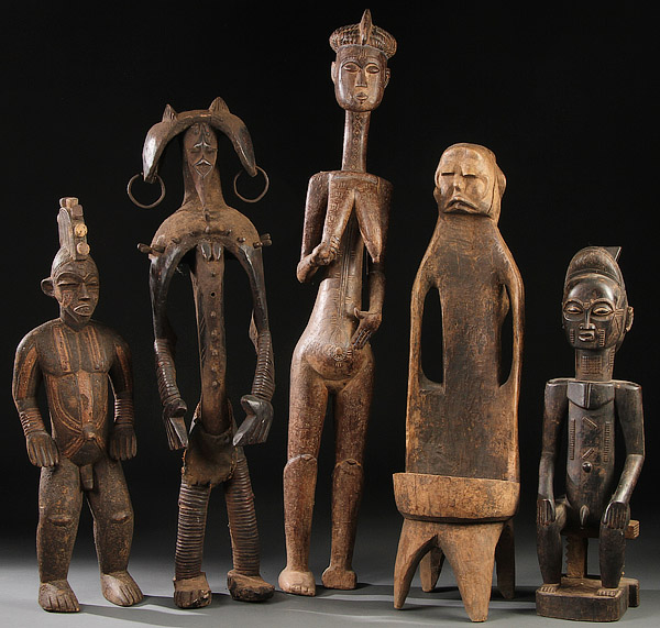 A GROUP OF FIVE CARVED WOOD AFRICAN FIGURES. Comprising a Calongo-style fertility figure, an Atti Baule-style seated male figure, a Mumuye-style figure and Idoma-style figure and a Janus-style stool. Greatest height 45.75 inches (116.4 cm).