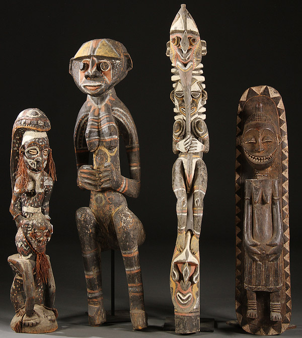 A GROUP OF FOUR CARVED WOOD AFRICAN FIGURES. Comprising Rapende and other styles. All with polychroming. Greatest height 52.5 inches (134 cm).