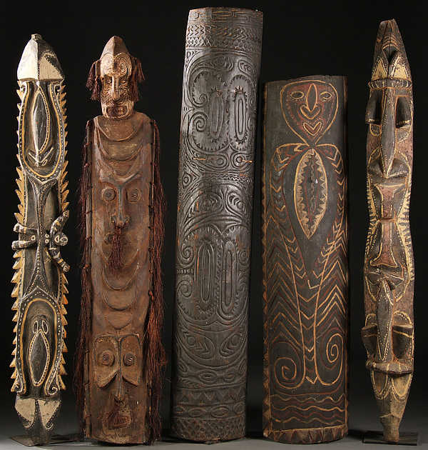 A GROUP OF FIVE LARGE NEW GUINEA/ SEPIC RIVER CULTURE CARVED WOOD SHIELDS AND PANELS. Some with polychroming. Greatest height 67.25 inches (171 cm).