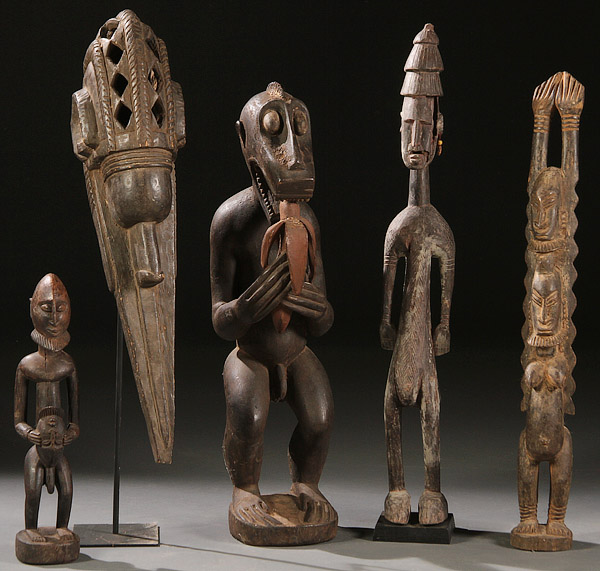 A GROUP OF FIVE CARVED WOOD AFRICAN FIGURES. Comprising Baule-style, Bamana-style, Dogon-style and a Baga-style shrine. Greatest height 34 inches (87 cm).