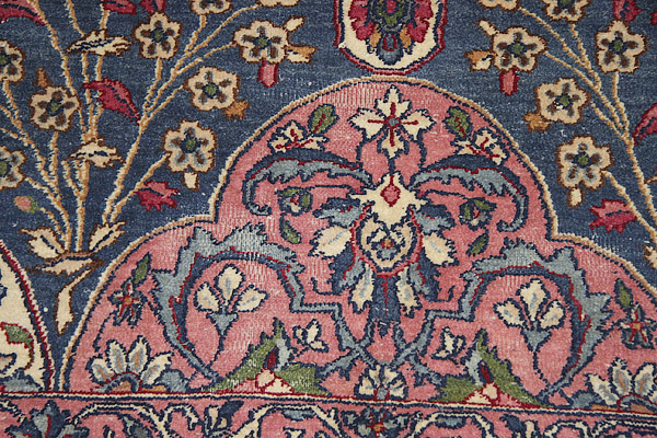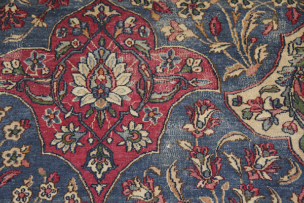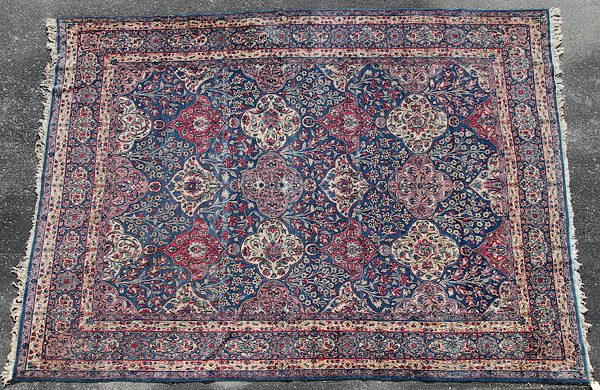 A HAND WOVEN ORIENTAL ROOM SIZE CARPET, EARLY 20TH CENTURY. With stylized design on a blue ground. 156 inches x 114 inches (396.2 x 289.5 cm).
