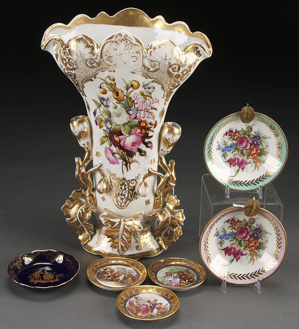 A LARGE AND IMPRESSIVE HAND PAINTED FLORAL AND GILT DECORATED OLD PARIS VASE, MID 19TH CENTURY. With extending foliate and leaf forms. Together with two Lefton porcelain trays and four Limoges miniature cabinet plates. Height 14 inches (35.5 cm).