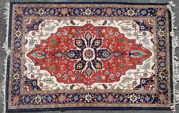 A HAND WOVEN ORIENTAL ROOM SIZE RUG, 20TH CENTURY. With geometrical designs on a red, ivory and blue ground. 112 inches x 76 inches (284.5 x 193 cm).
