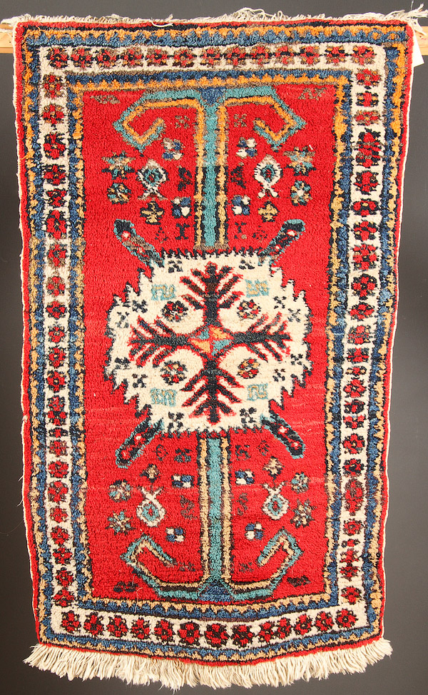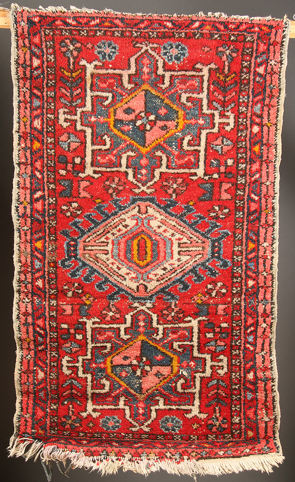 THREE HAND WOVEN ORIENTAL RUGS, 20TH CENTURY. With geometrical designs on red grounds. 40 inches x 25 inches to 63 inches x 25 inches (101.6 x 63.5 cm to 160 x 63.5 cm).