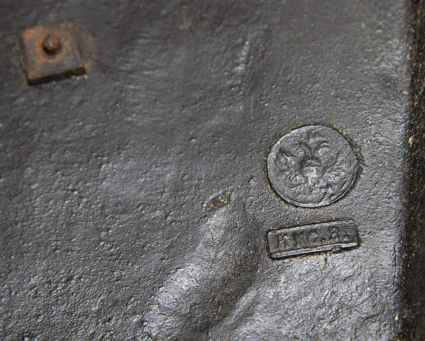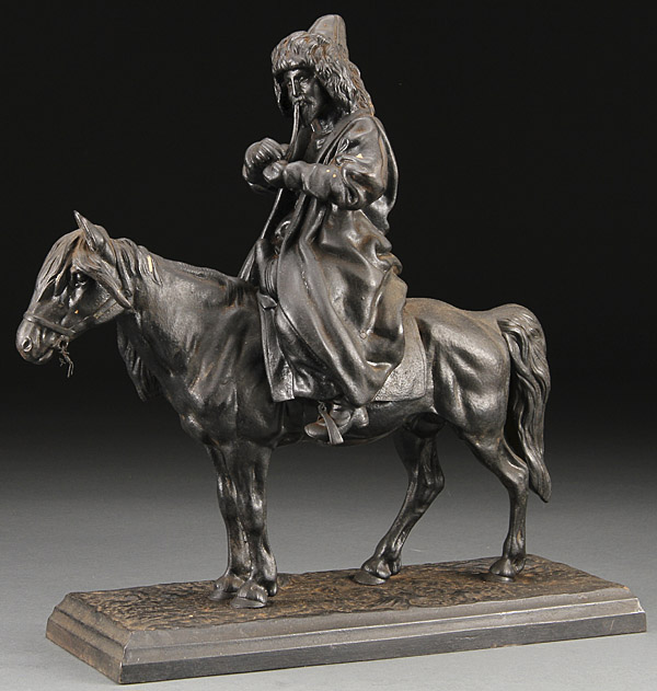 A RUSSIAN FIGURE OF A HORSE MOUNTED MONGOL, CIRCA 1900, CAST IRON WITH A BLACK PATINA. Signed on underside of base KUS.Z. in Cyrillic beneath a double headed Imperial Warrant. Height 14.5 inches (36.8 cm).