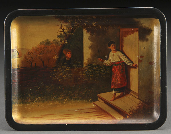A RUSSIAN LACQUERED TRAY, VISHNIAKOV, CIRCA 1890. A finely painted tray depicting a young country girl sneaking out of the house to meet her suitor, verso with the factory stamp of Vishniakov beneath numerous awards, 5.75 inches x 7.75 inches (14.7 x 19.8 cm)